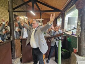Bevor nun der neue Gesellschaftskönig ermittelt wurde, gab es noch den Vogel um die Würde des König der Könige. Zuerst durften die Gäste alleine auf die Fender schießen und danach alle ehemaligen Scheibenschützen Könige auf den Rumpf. Dabei hat jeder Schütze so viele Schüsse, wie oft er die Königswürde in seiner Gesellschaftslaufbahn errungen hat. Und am Ende holte Florian Eysell den Vogel runter.